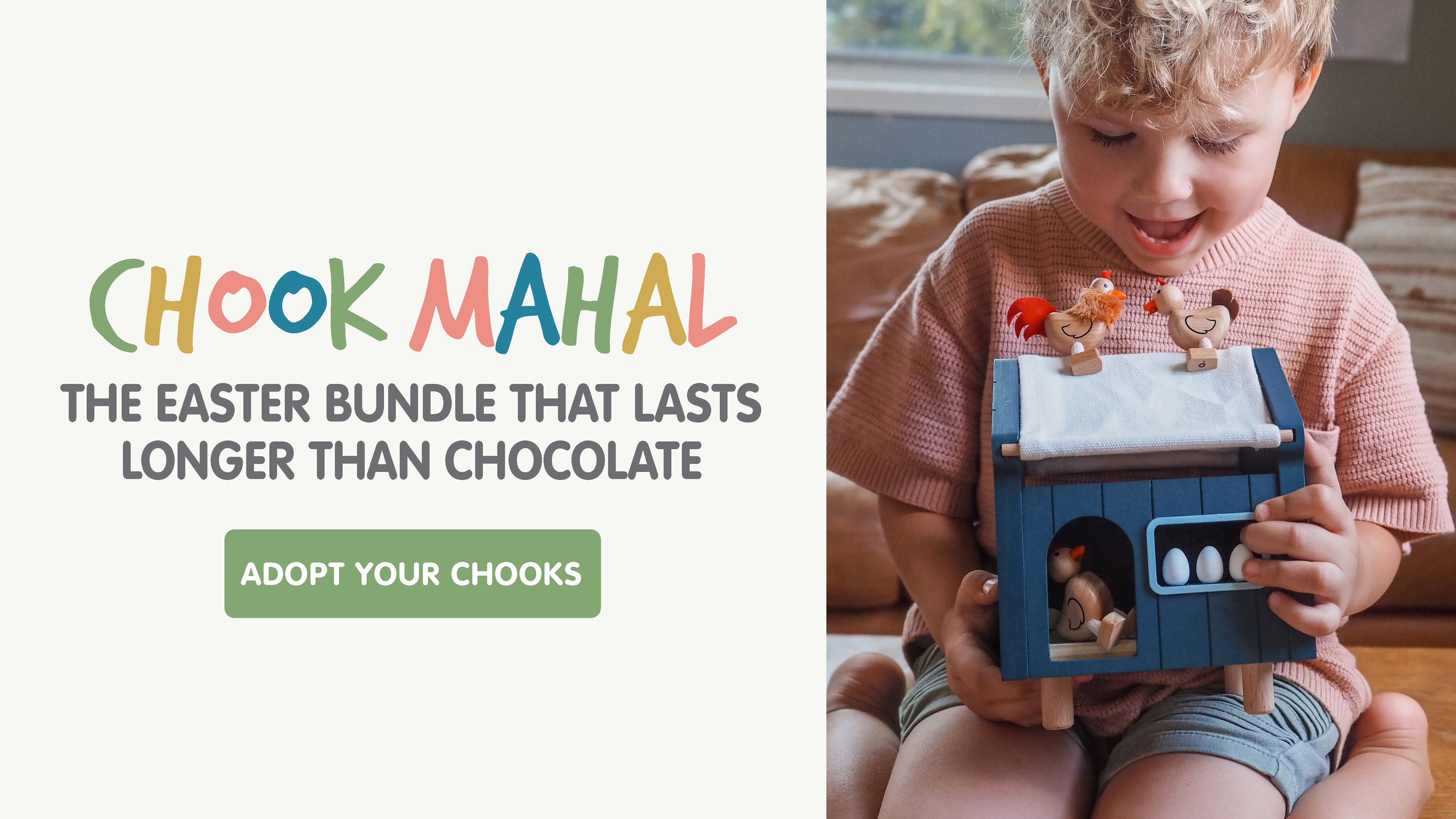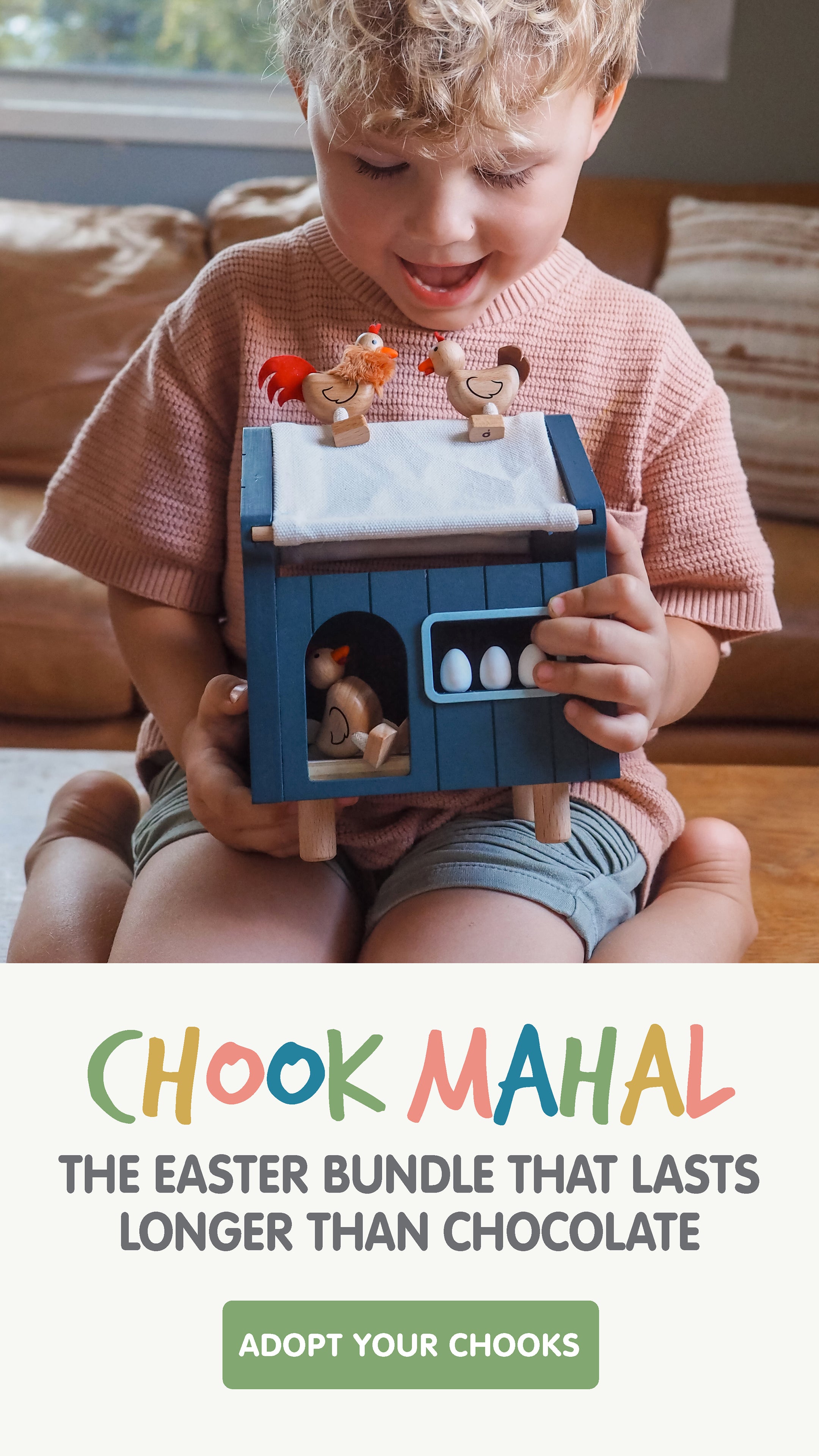 Child playing with a toy chicken coop set in a living room.